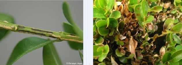Die meisten Krankheiten beim Buchs kündigen sich durch das Abwerfen oder gelb/braunfärbungen der Blättern an. Schon junge Blätter haben orange-braune Flecken und ältere einheitlich braune Verfärbungen, zudem ist die Rinde mit dunklen bis schwarzen Streifen durchzogen.