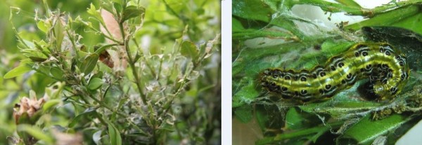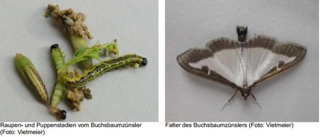 Dieser Schädling wurde aus Asien Seit dem Jahre 2006 wird Buchsbaum von einem neuen Schädling befallen, dem Buchsbaumzünsler (Diaphania perspectalis). Der aus Ostasien (Japan, Korea und Ostchina) stammende Kleinschmetterling trat zuerst in Baden-Württemberg auf, 2008 wurde er dann auch in Nordrhein-Westfalen und Niedersachsen gesichtet. Mittlerweile hat er sich stark ausgebreitet. Die Raupen des Buchsbaumzünslers können erhebliche Fraßschäden an Blättern und Trieben verursachen. Sie sitzen häufig verstreckt in Gespinsten, wo sie auch helle Kotkrümel zurücklassen. Es kann schnell zum Kahlfraß der Buchsbaumpflanzen kommen. Durch einen Fraß an der Rinde sterben zum Teil ganze Triebe ab.